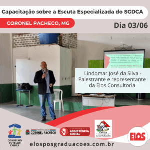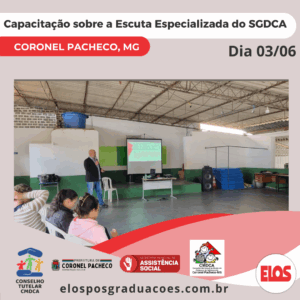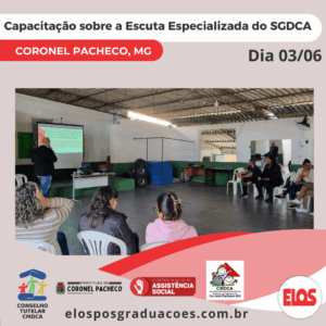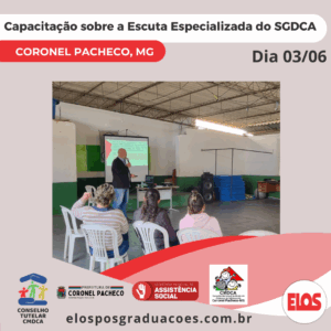 A Prefeitura Municipal de Coronel Pacheco, por meio da Secretaria Municipal de Assistência Social, do Conselho Municipal dos Direitos da Criança e do Adolescente – CMDCA, realiza a Capacitação sobre a Escuta Especializada dos atores do Sistema de Garantia dos Direitos da Criança e do Adolescente – SGDCA nos parâmetros da Escuta Especializada, conforme Lei 13.431, de 4 de abril de 2017. A capacitação é intitulada: “Capacitar é Fortalecer-se para Cuidar e Garantir Direitos de crianças e adolescentes com segurança”.